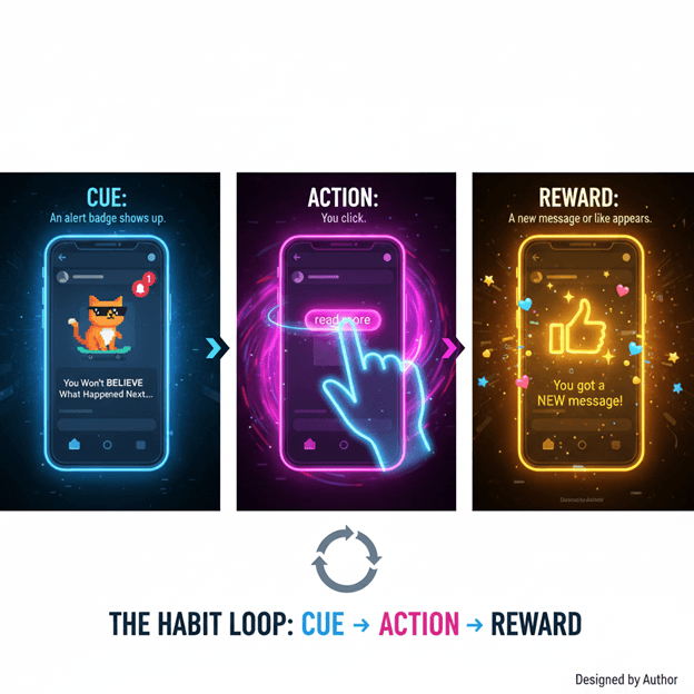 Repeating the same actions leads to the creation of neural pathways, making the corresponding action easier to perform and more automatic. The habit loop gets deeper the more we go online: